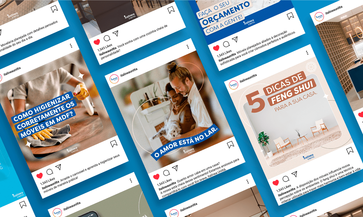 Como Social Media e Designer Gráfico da Italínea Unittà, fui responsável pelo planejamento e criação das postagens. Utilizamos Linhas Editoriais definidas (temas) e mantivemos uma periodicidade de três posts semanais, além de campanhas com tráfego pago. As postagens variavam entre conteúdos estáticos, carrosséis e composições que se complementavam visualmente no feed.